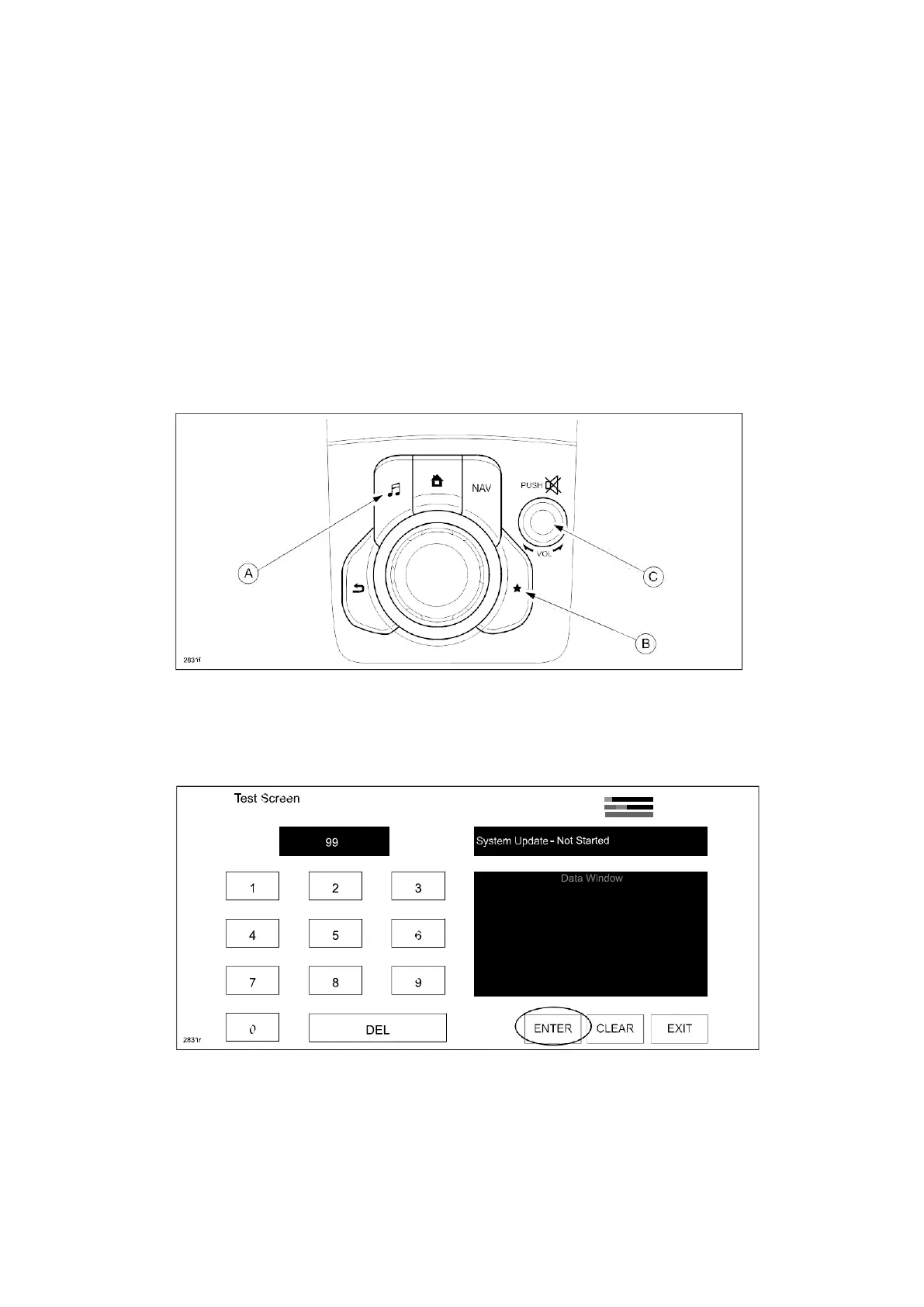21. Press the three buttons (Music (A) + Favorites (B) + Volume Mute(C)) on the