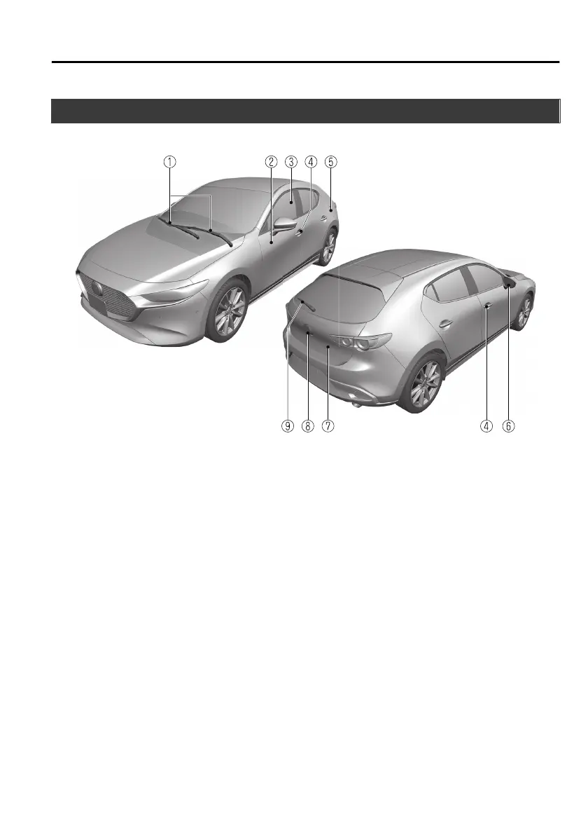 ⑨ Rear window wiper blade.................................................................. page 6-37