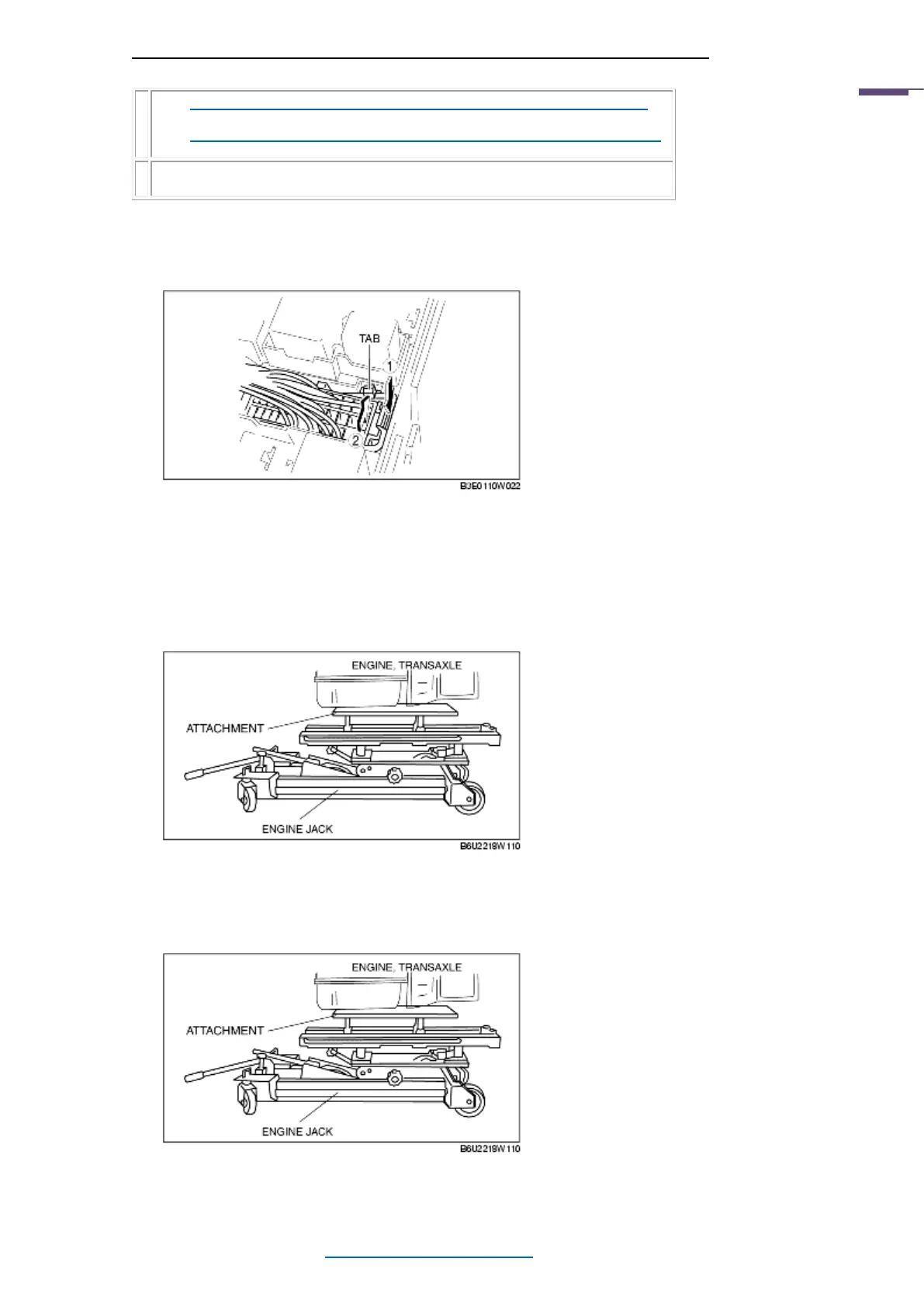 1. Secure the engine and the transaxle using an engine jack and attachment as shown in the figure.