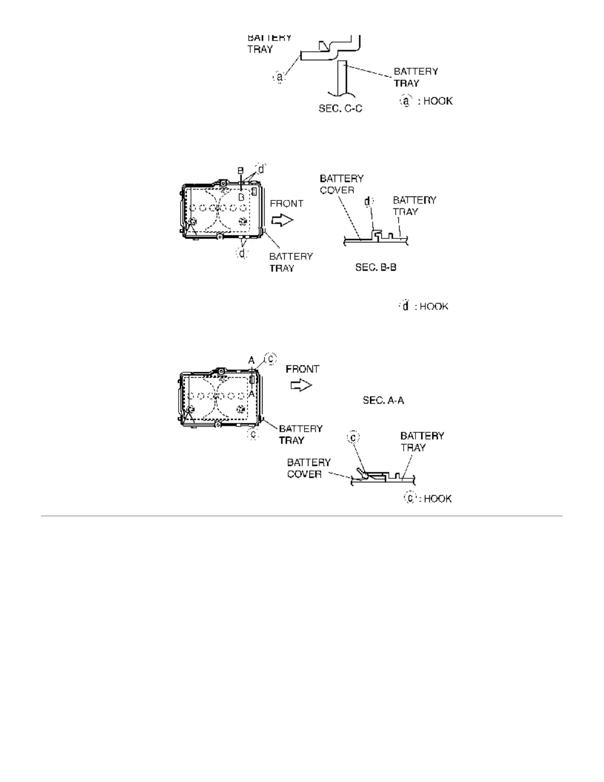 Set the battery cover to battery tray hooks C at two points.4.