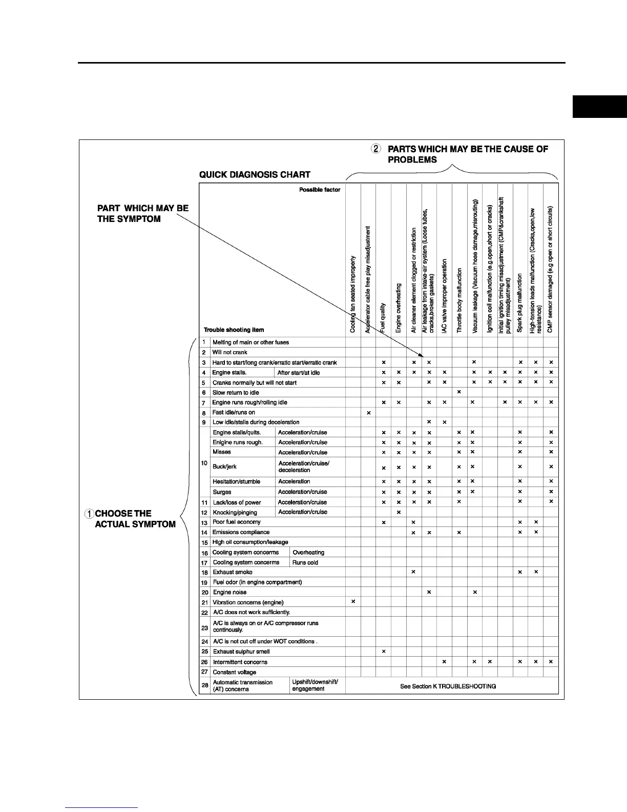 • The chart is effective in quickly narrowing down the relation between symptom and cause of the malfunction. It