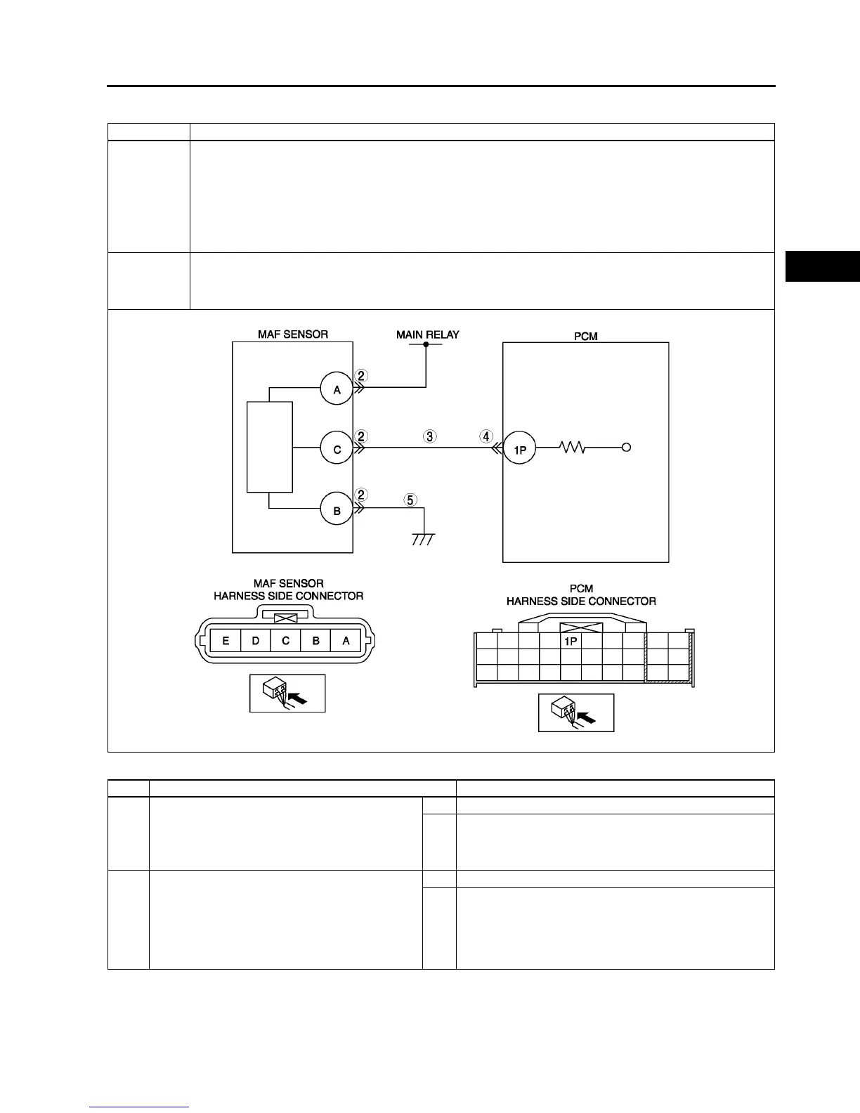 • PCM monitors input voltage from MAF sensor when engine running. If input voltage at PCM terminal 1P is