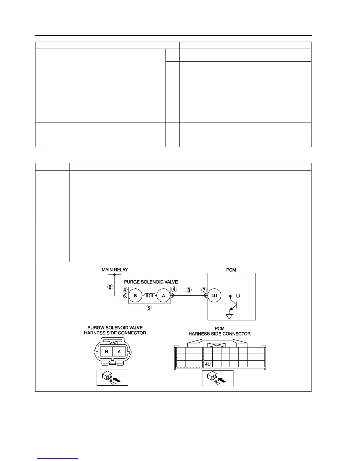 • Open circuit in wiring between purge solenoid valve terminal A and PCM terminal 4U