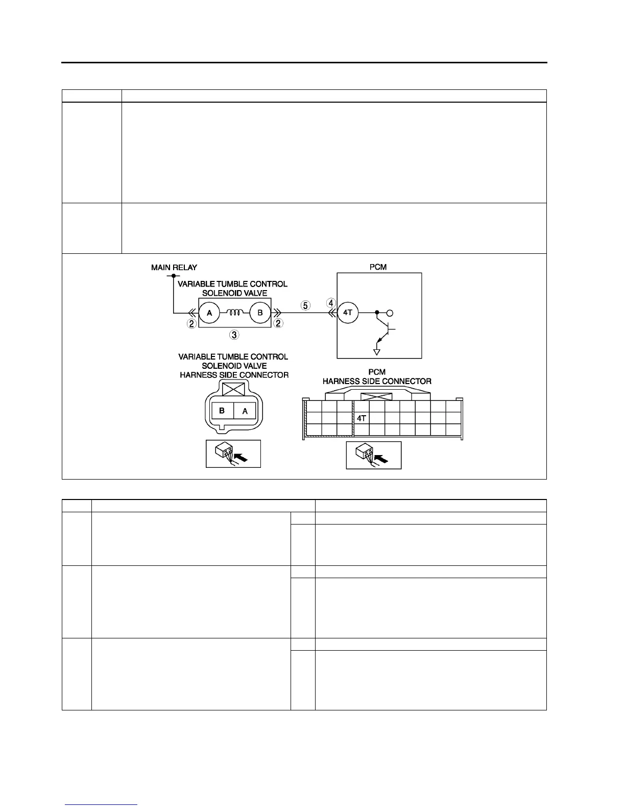 • PCM monitors variable tumble control solenoid valve control signal at PCM terminal 4T. If PCM turns