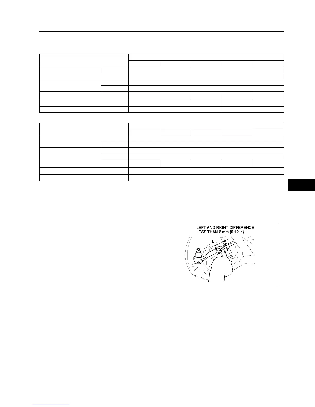 • Turning both tie-rods one complete turn changes toe-in by about 6 mm {0.24 in} (0°
