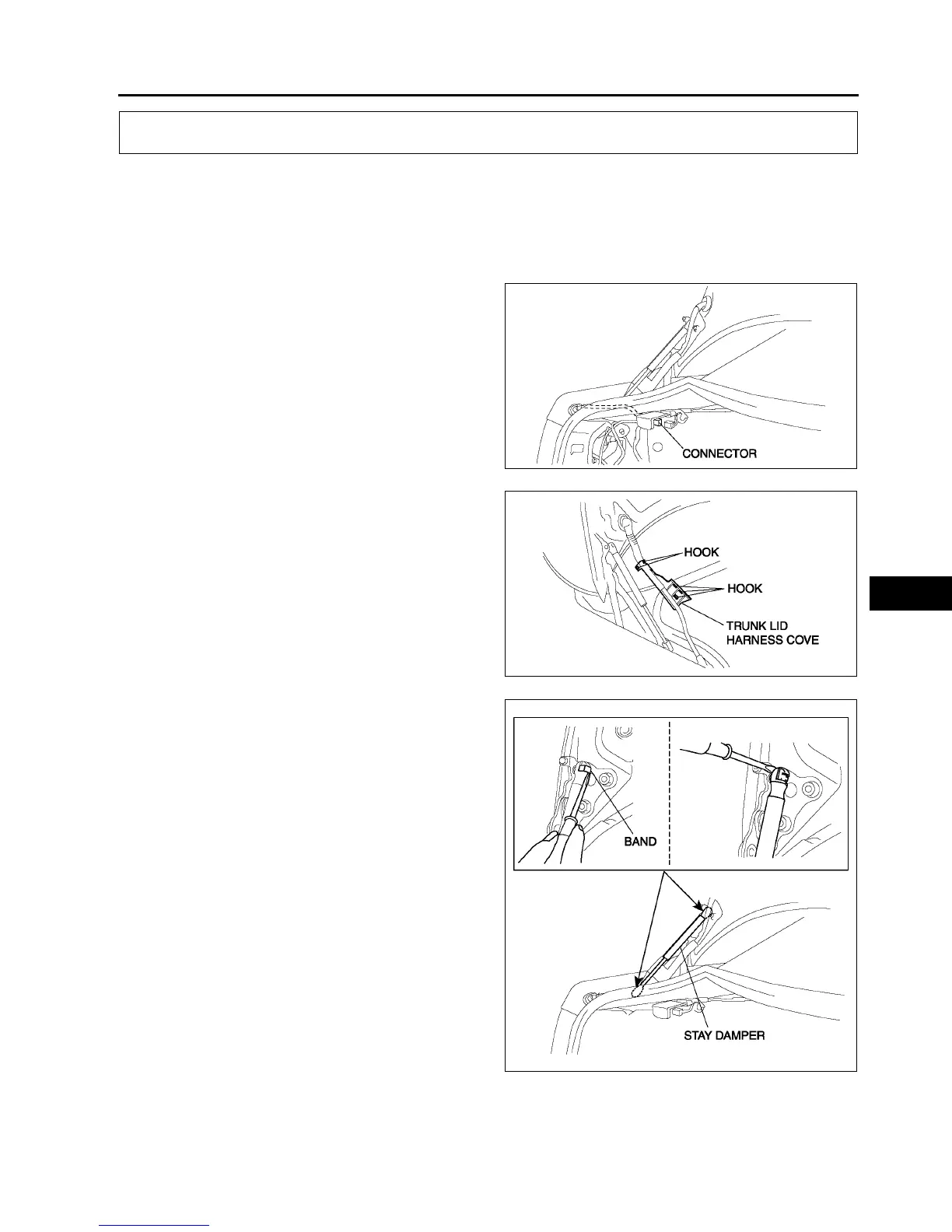 • Removing the stay damper without supporting the trunk lid can be dangerous. The trunk lid may