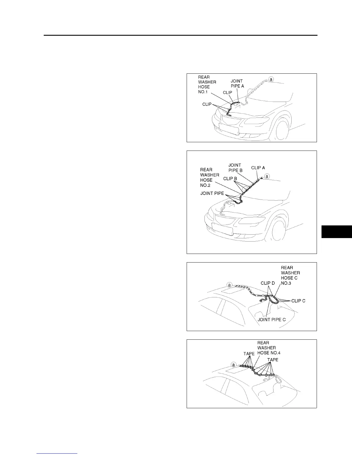 16. Remove the tape from rear washer hose No.4.