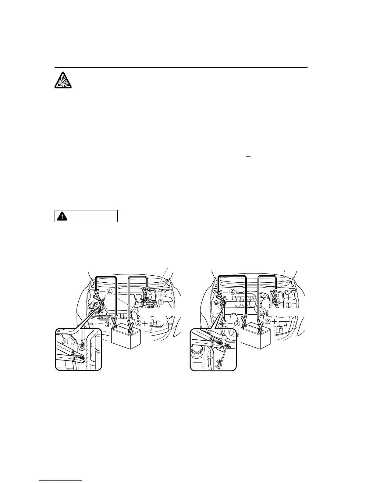 Do not jump-start a frozen battery or one with a low fluid level:
