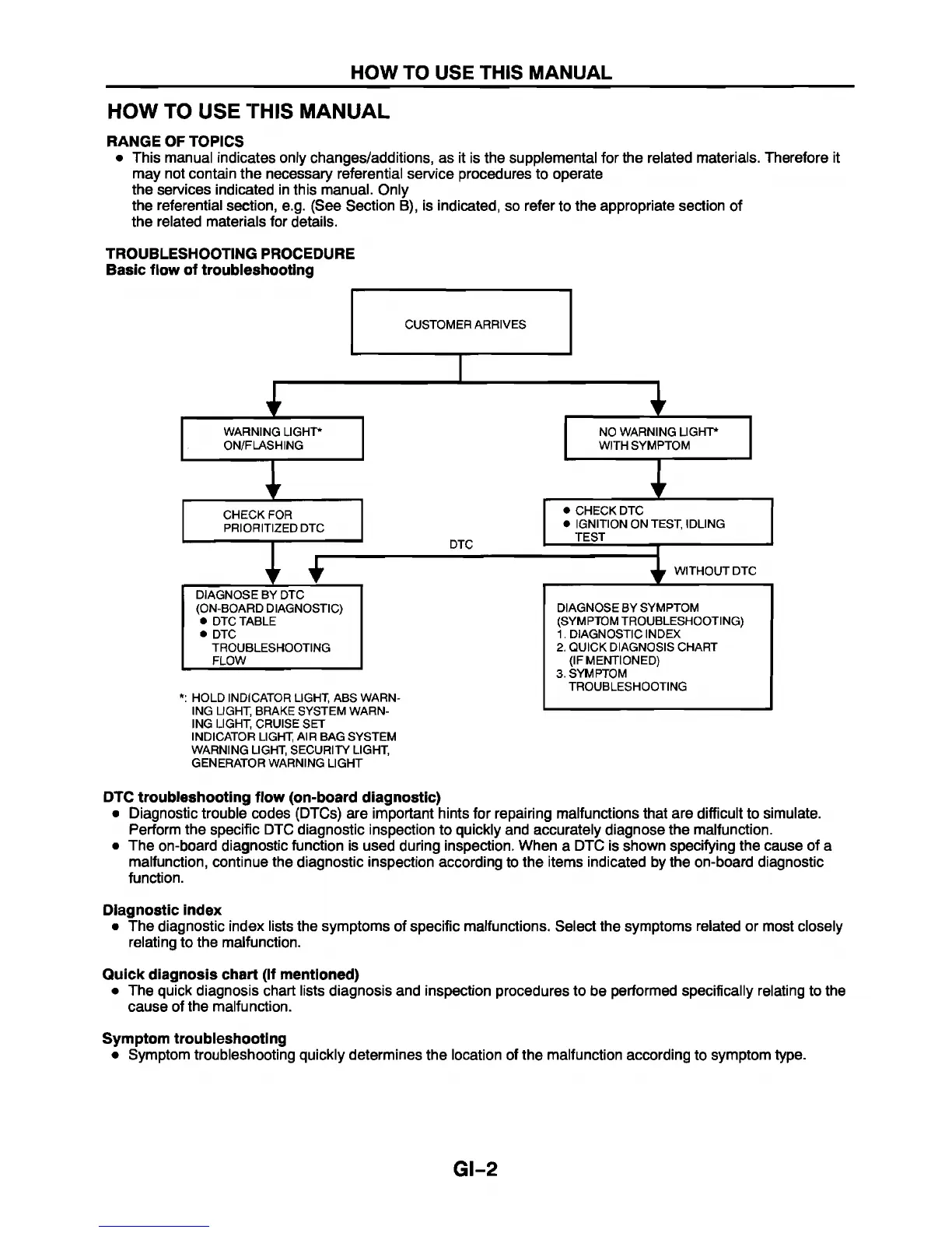 • The quick diagnosis chart lists diagnosis and inspection procedures to be performed specifically relating to the