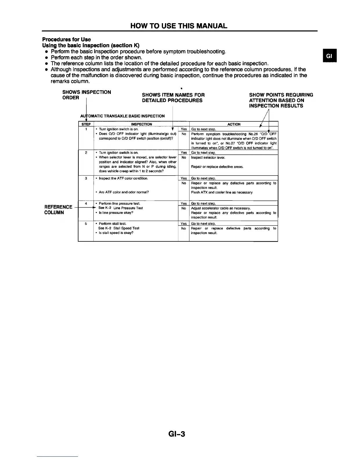 • The reference column lists the location of the detailed procedure for each basic inspection.