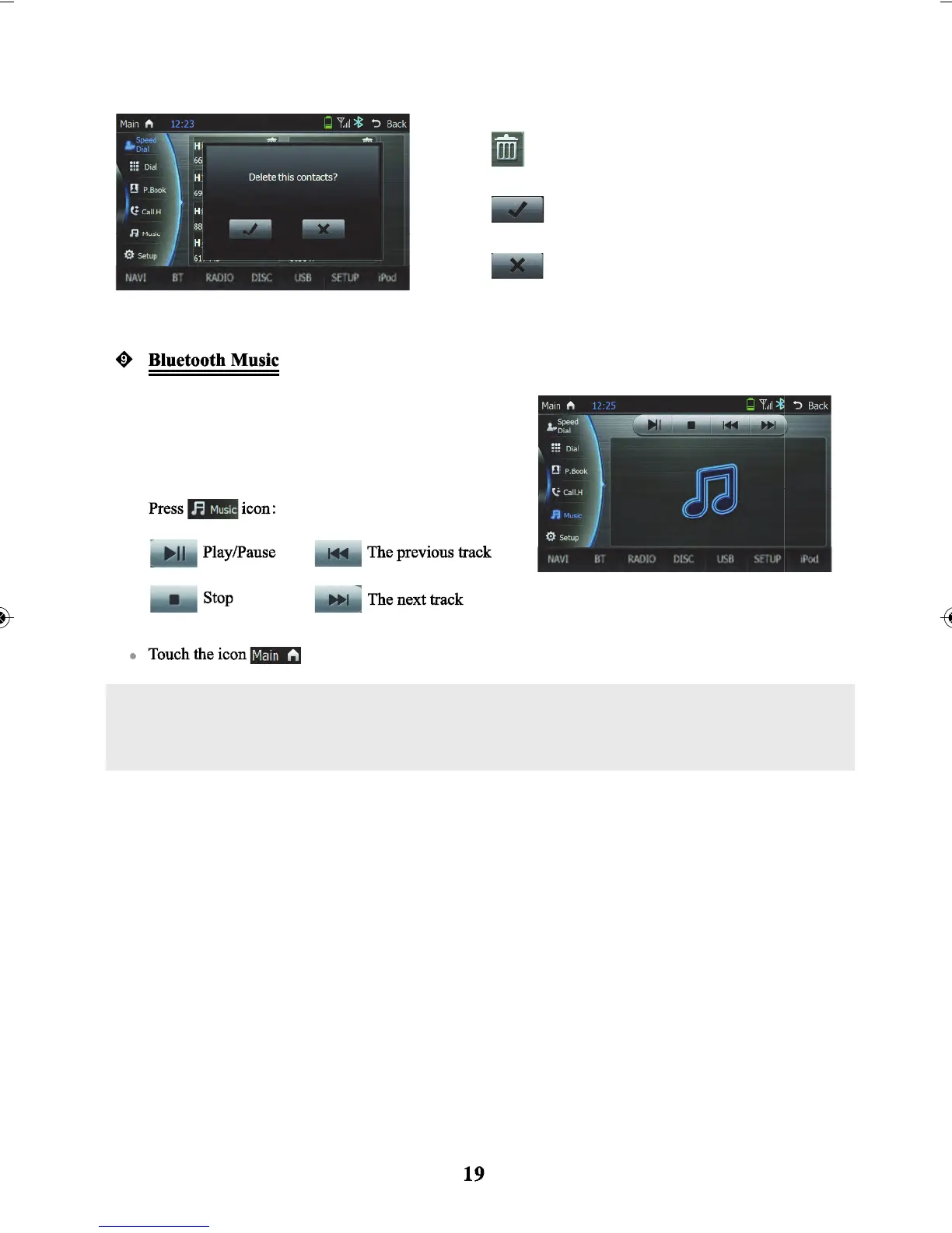 to enter into the main menu, touch these icons to exit Bluetooth music interface.