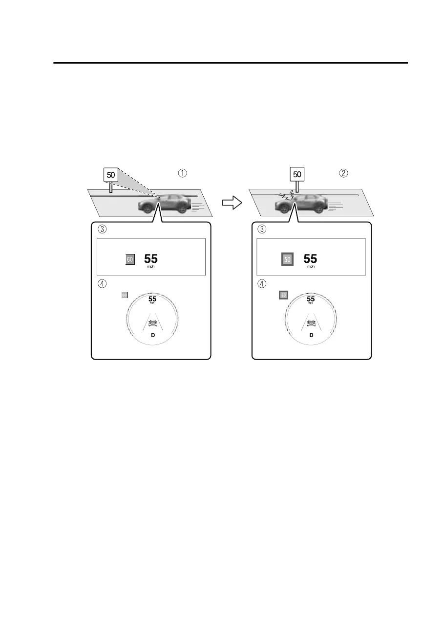 1. Vehicle is doing 55 mph when 50 mph speed limit sign is recognized.