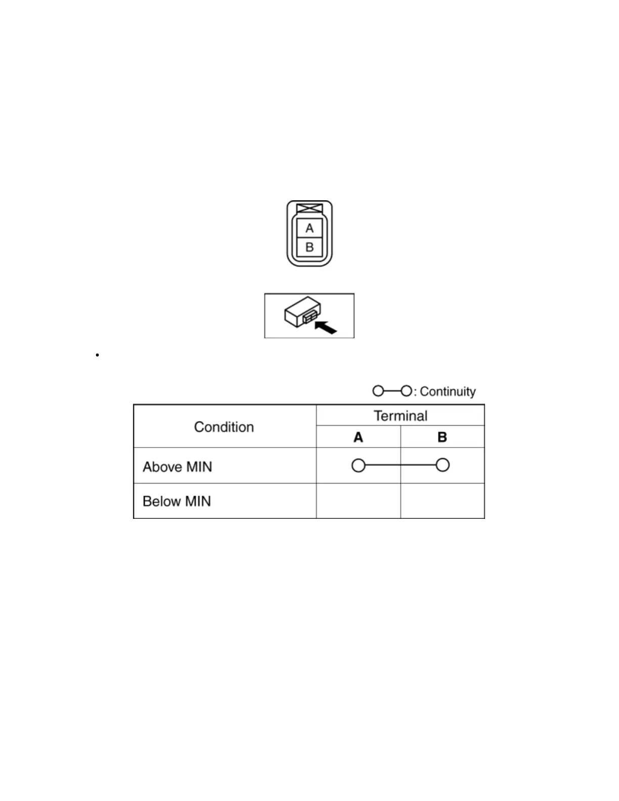 2. Inspect for continuity according to fluid level between the brake fluid level sensor terminals.