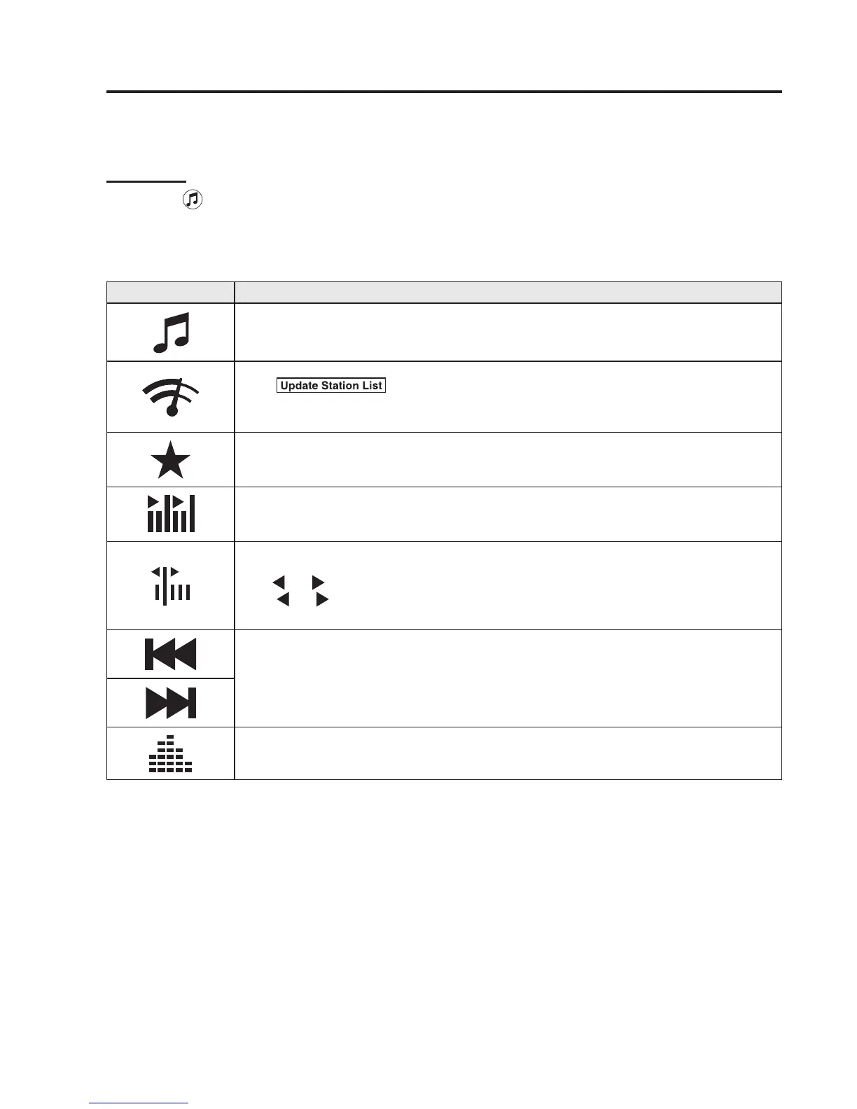 Displays the Favourites list. Long-press to store radio station currently being aired.