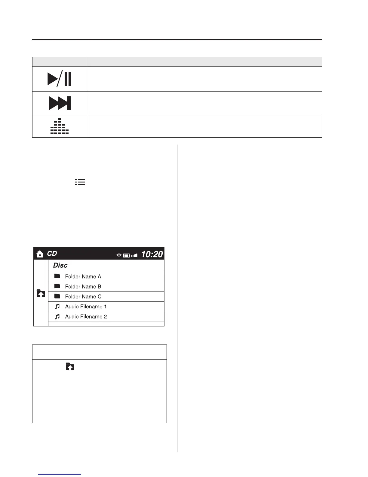 Plays a CD. When selected again, playback is temporarily stopped.
