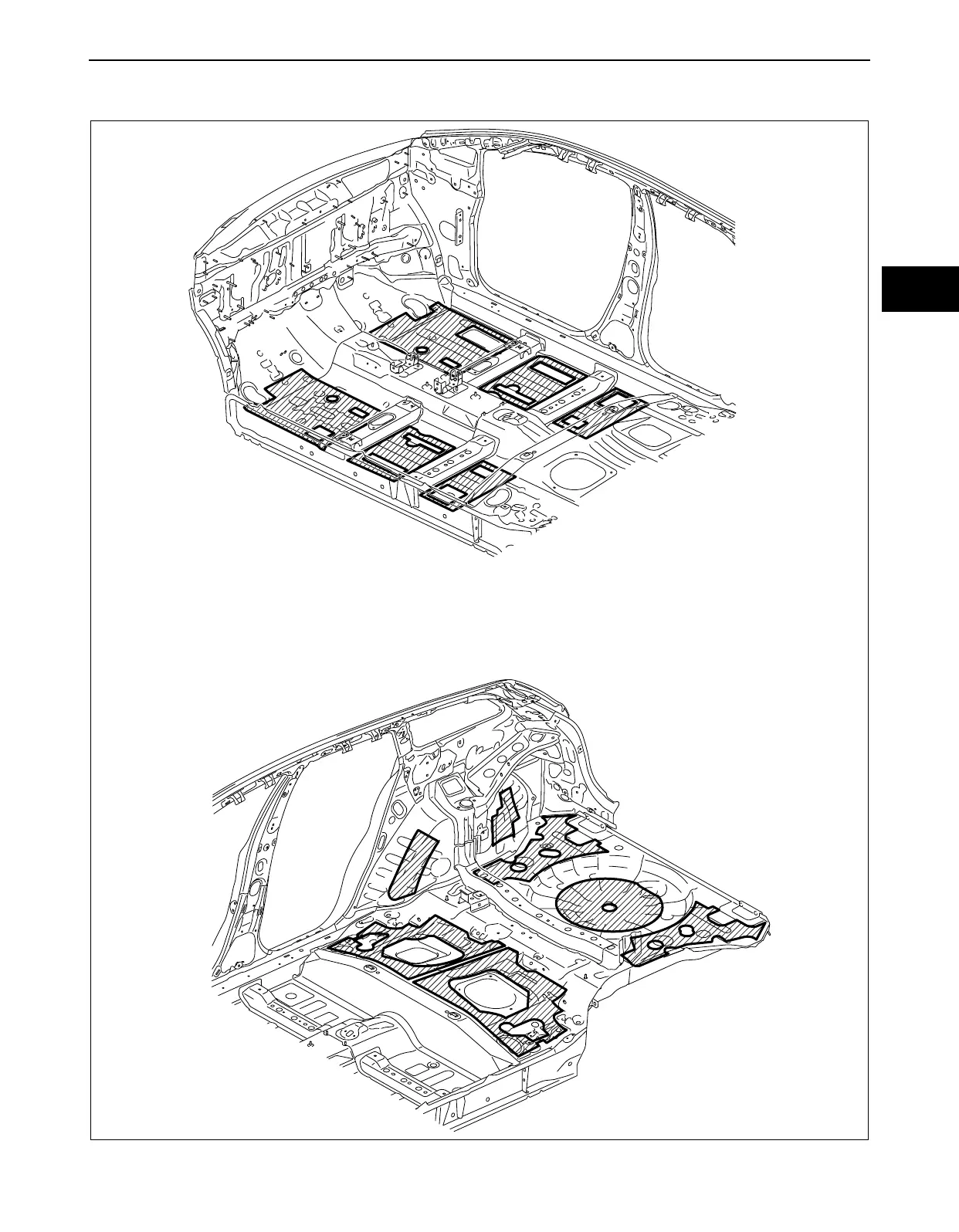 After repairing the body, attach the dumping sheet to the location shown in the figure for noise insulation.