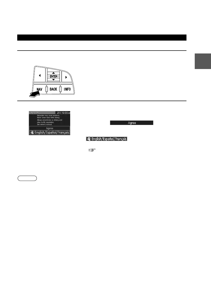With the ignition switched to ACC or ON, press the Navi switch on the steering
