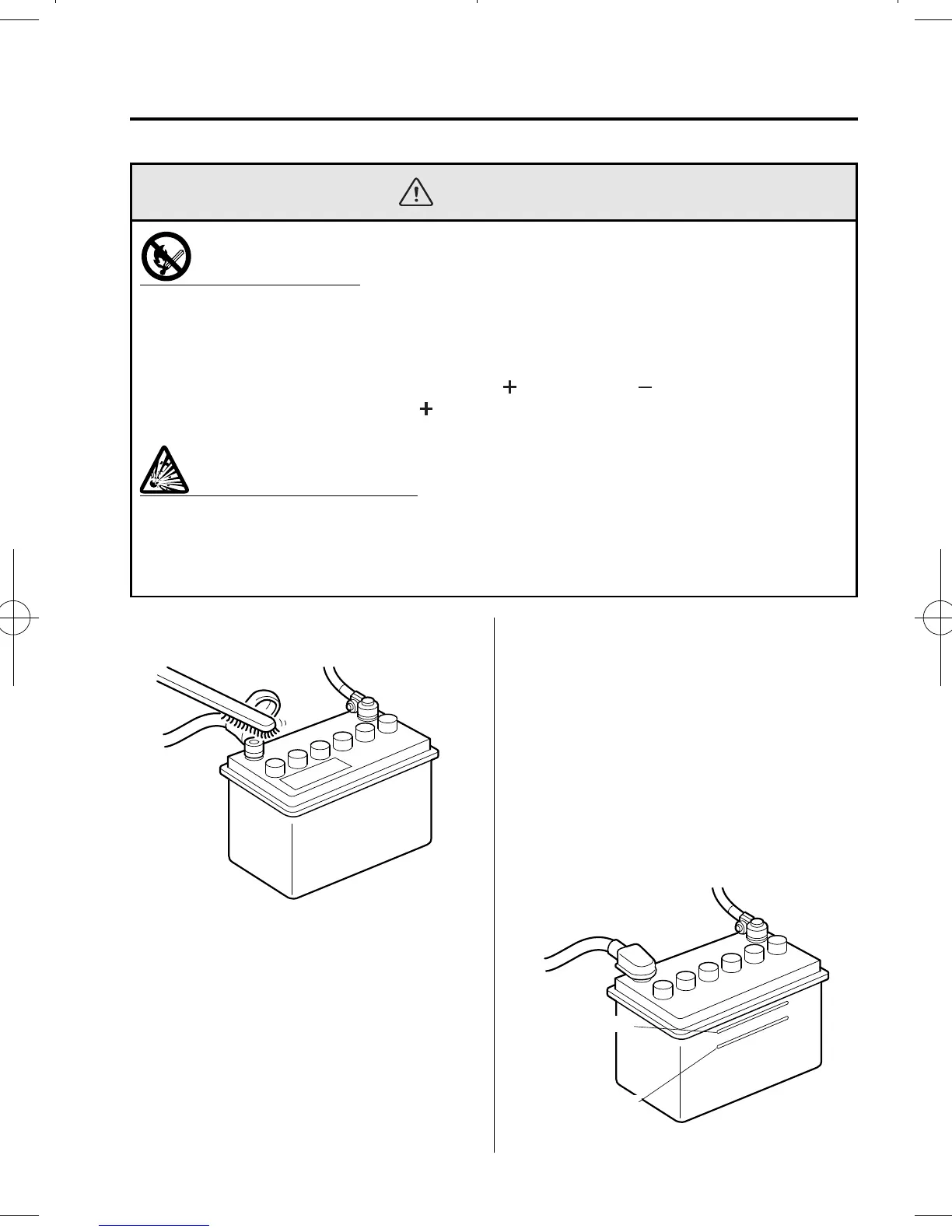 cigarettes and sparks away from open battery cells. When working near a battery, do