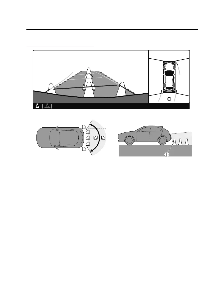 In the top view screen, the areas in black at the front and rear of the vehicle image
