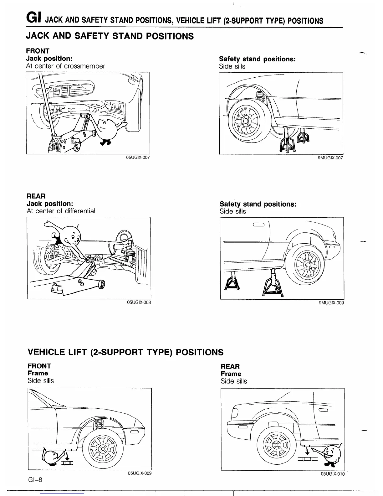 Mazda MX-5 1990 - Vehicle Lifting and Towing; Jack and Safety Stand Positions; Vehicle Lift (2-Support Type) Positions