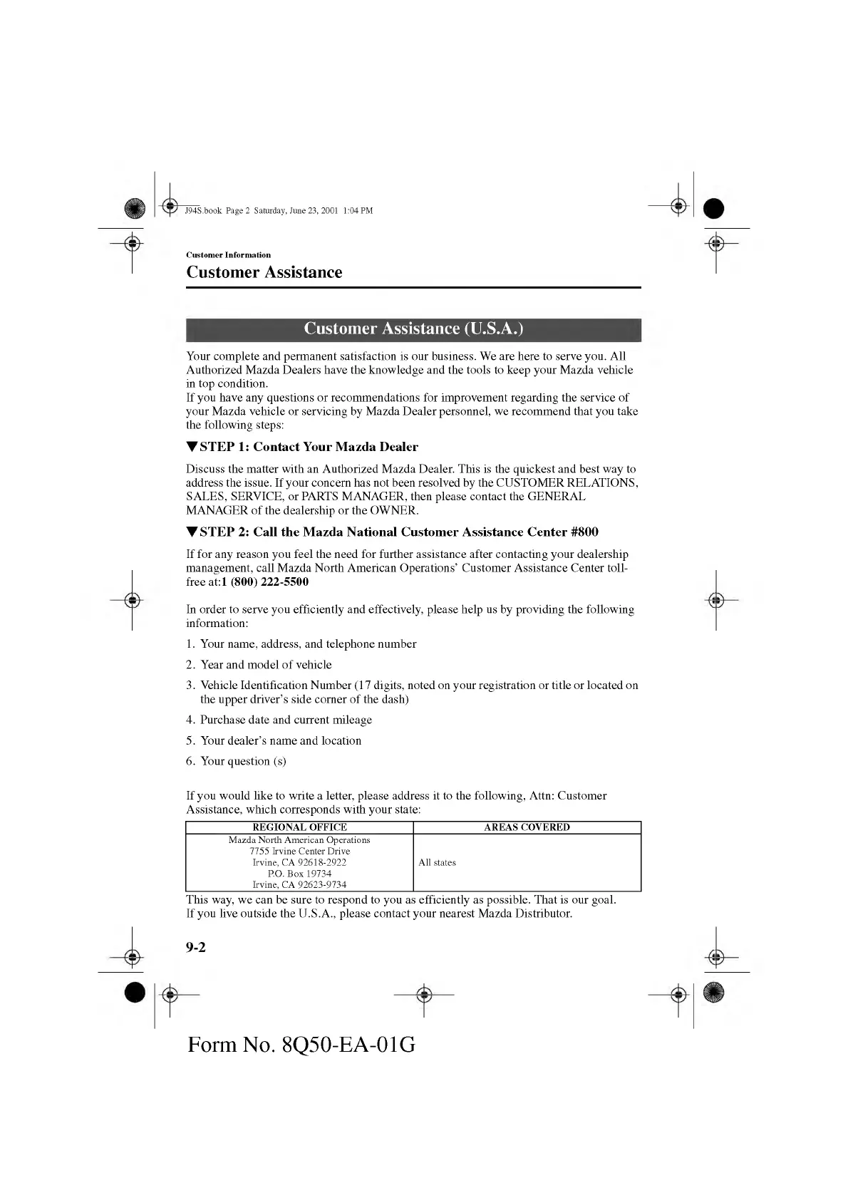management, call M azda North American Operations’ Custom er Assistance Center toll-