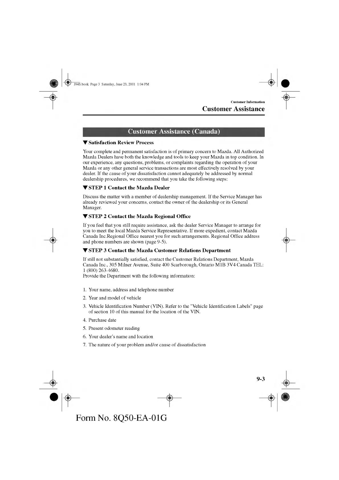 If still not substantially satisfied, contact the Custom er Relations Department, Mazda