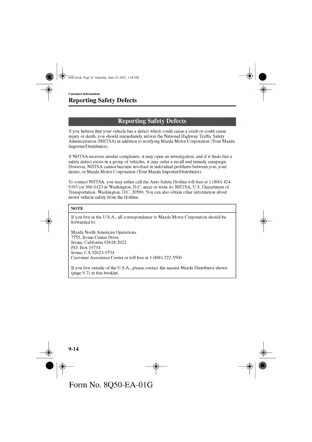 Administration (NHTSA) in addition to notifying Mazda M otor Corporation (Your Mazda