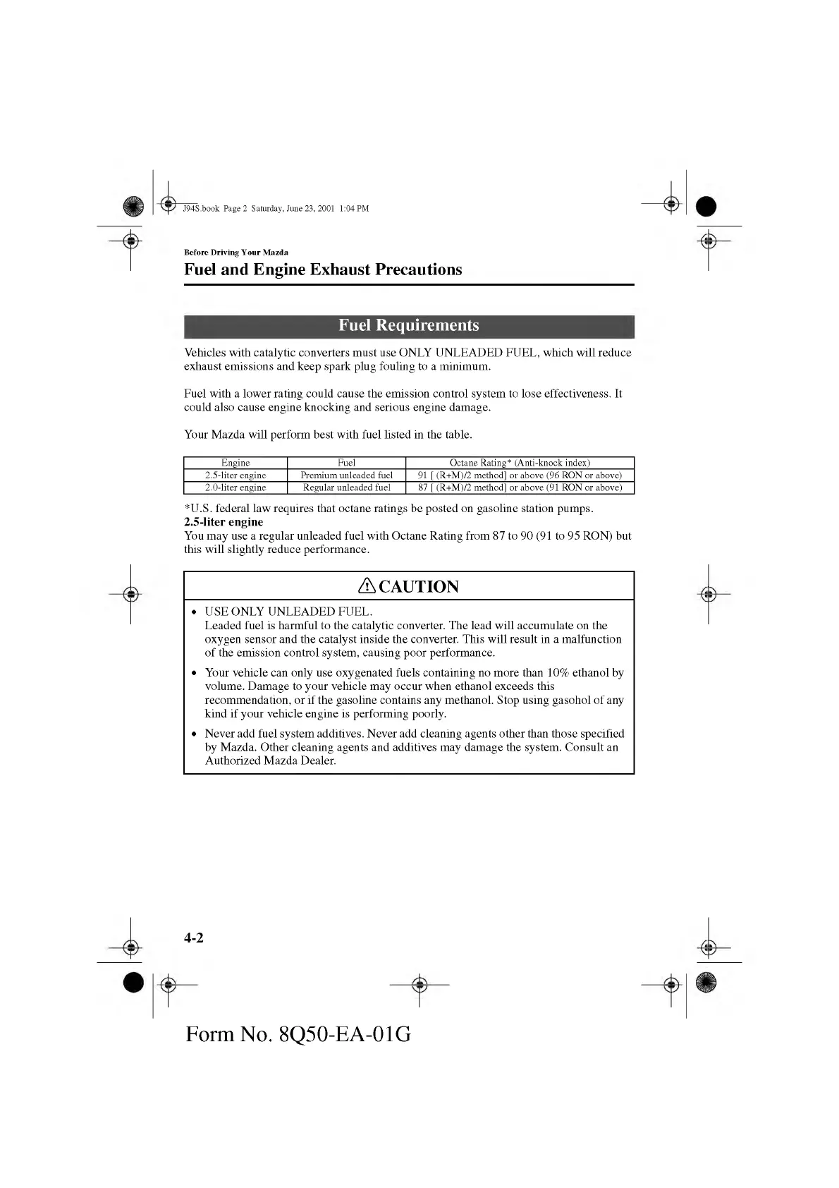 Your Mazda will perform best with fuel listed in the table.
