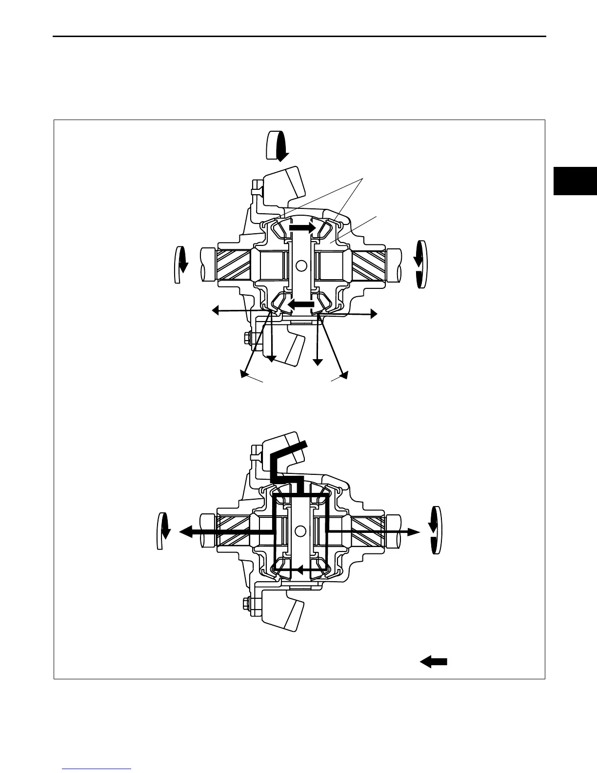 • If the differential encounters a condition requiring limited-slip control such as wheel spin, thrust force acts on