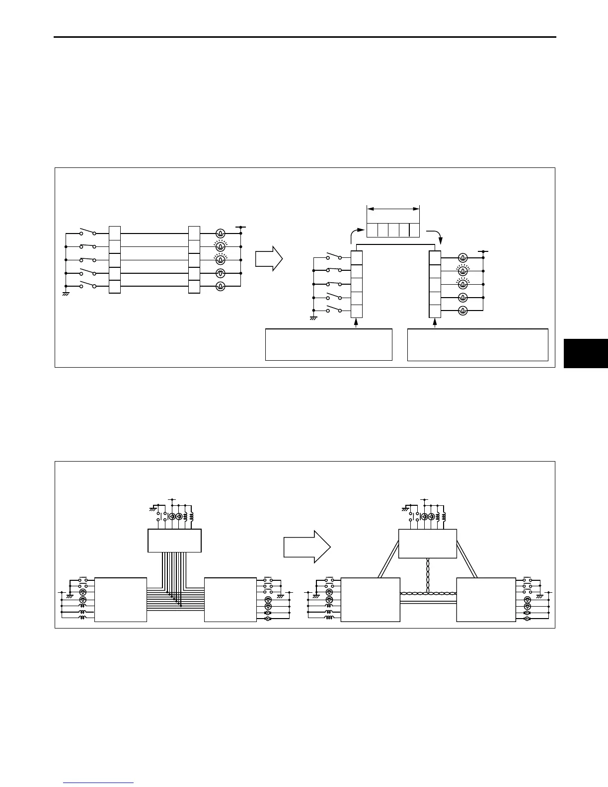 • In the conventional, non-multiplex system, in order to control the illumination of five bulbs, one switch and one