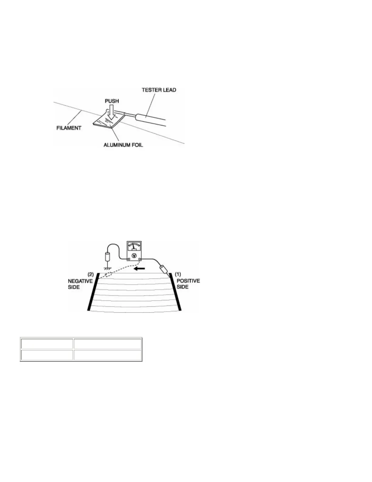 • Directly touching the rear window defroster filament with the lead of the voltmeter could