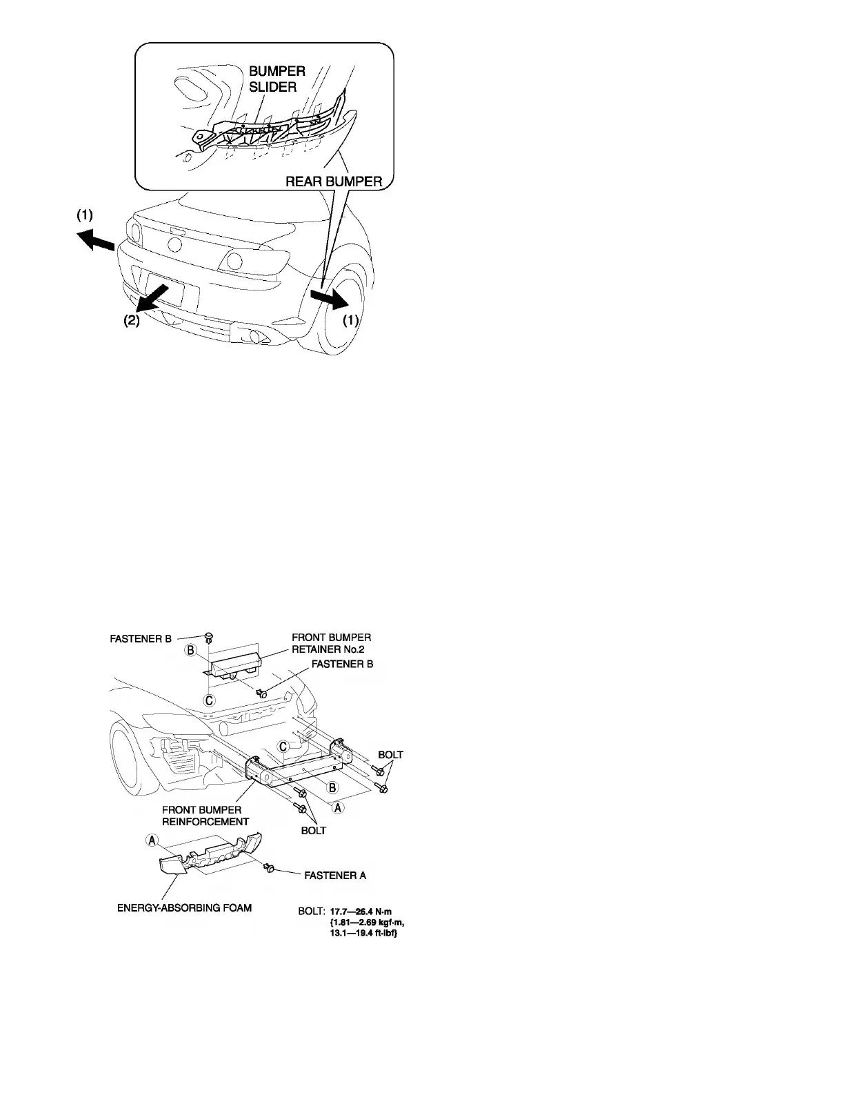 5. Remove fasteners B, then remove front bumper retainer No.2.