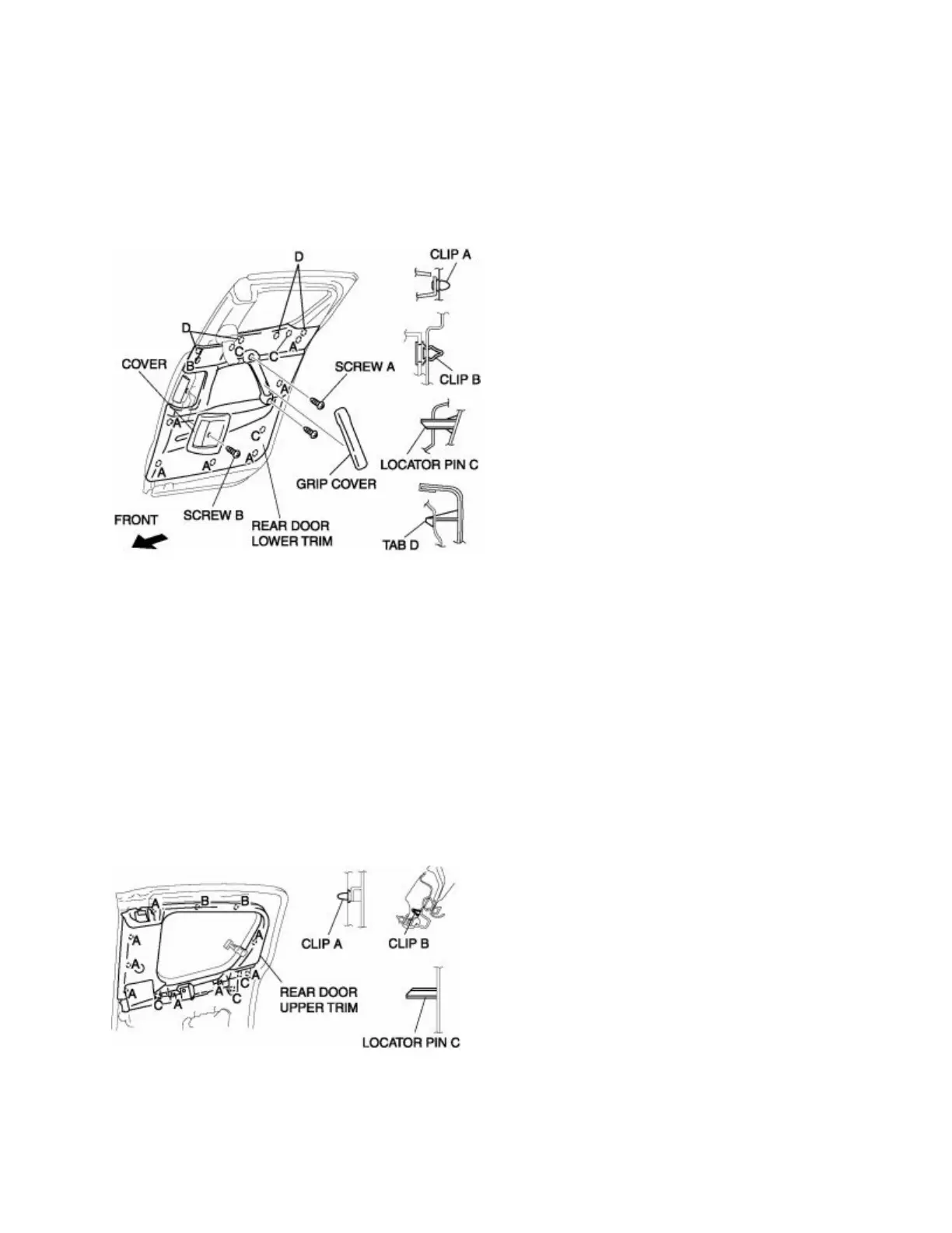3. Pull the rear door upper trim outward and detach clips A, B and locator pins C from the body.