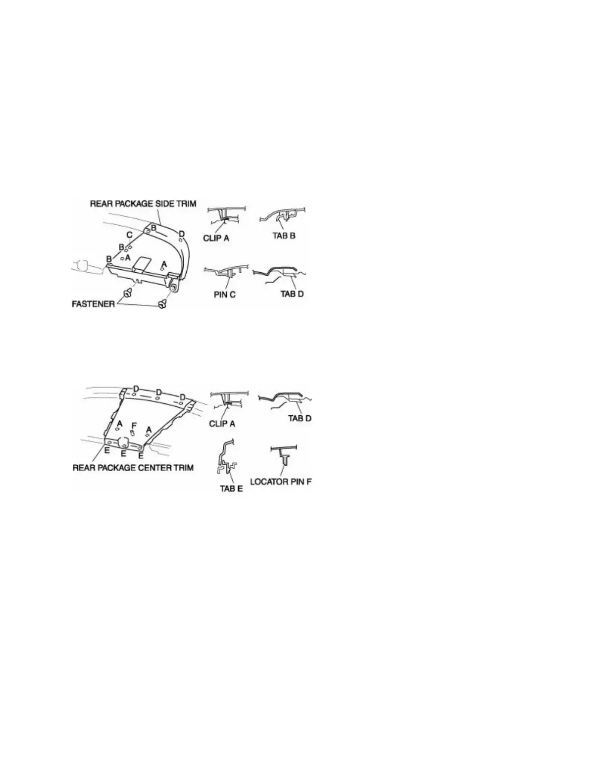 6. Pull the rear package center trim upward and detach clips A, tabs E, and locator pin F from the body.