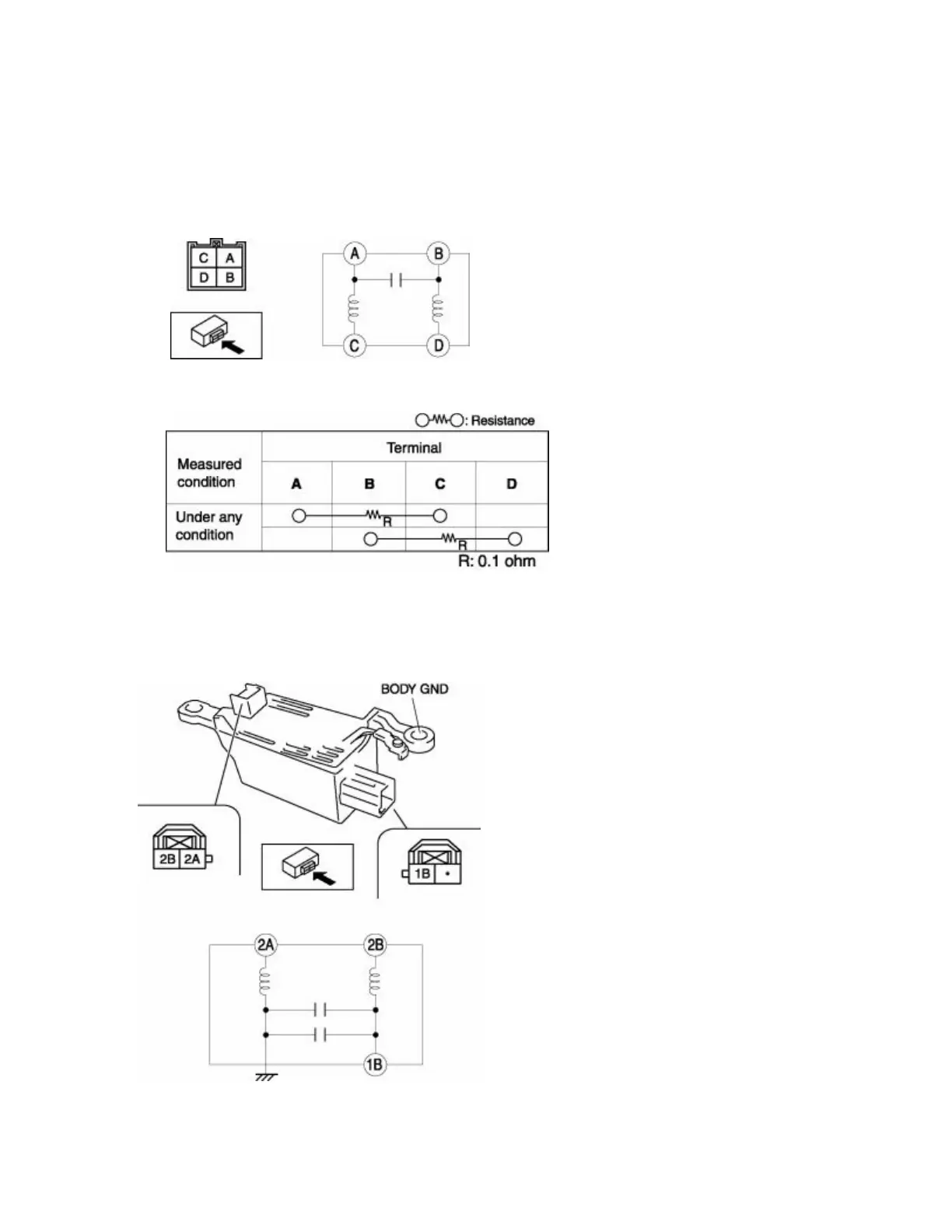 1. Verify the resistance and continuity between the brake light noise filter terminals.