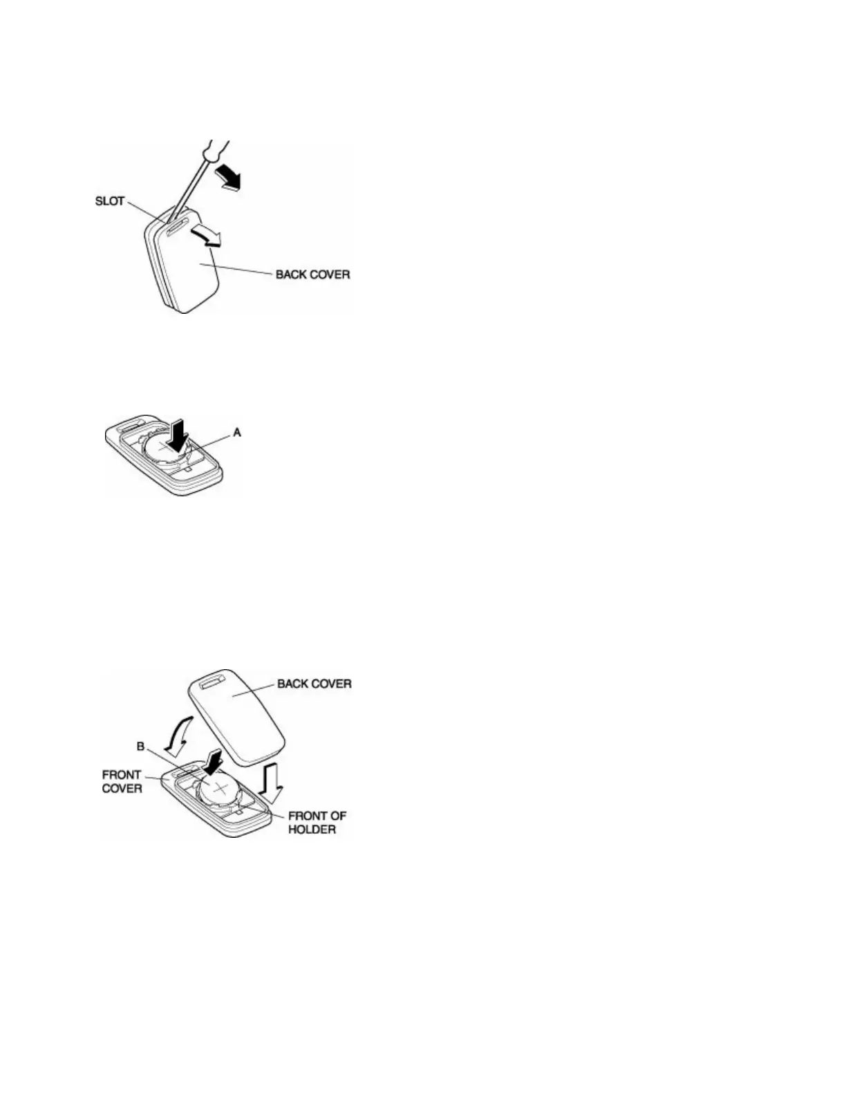 3. Install a new battery (CR2025) into the front portion of the holder with the positive pole (+) facing up.