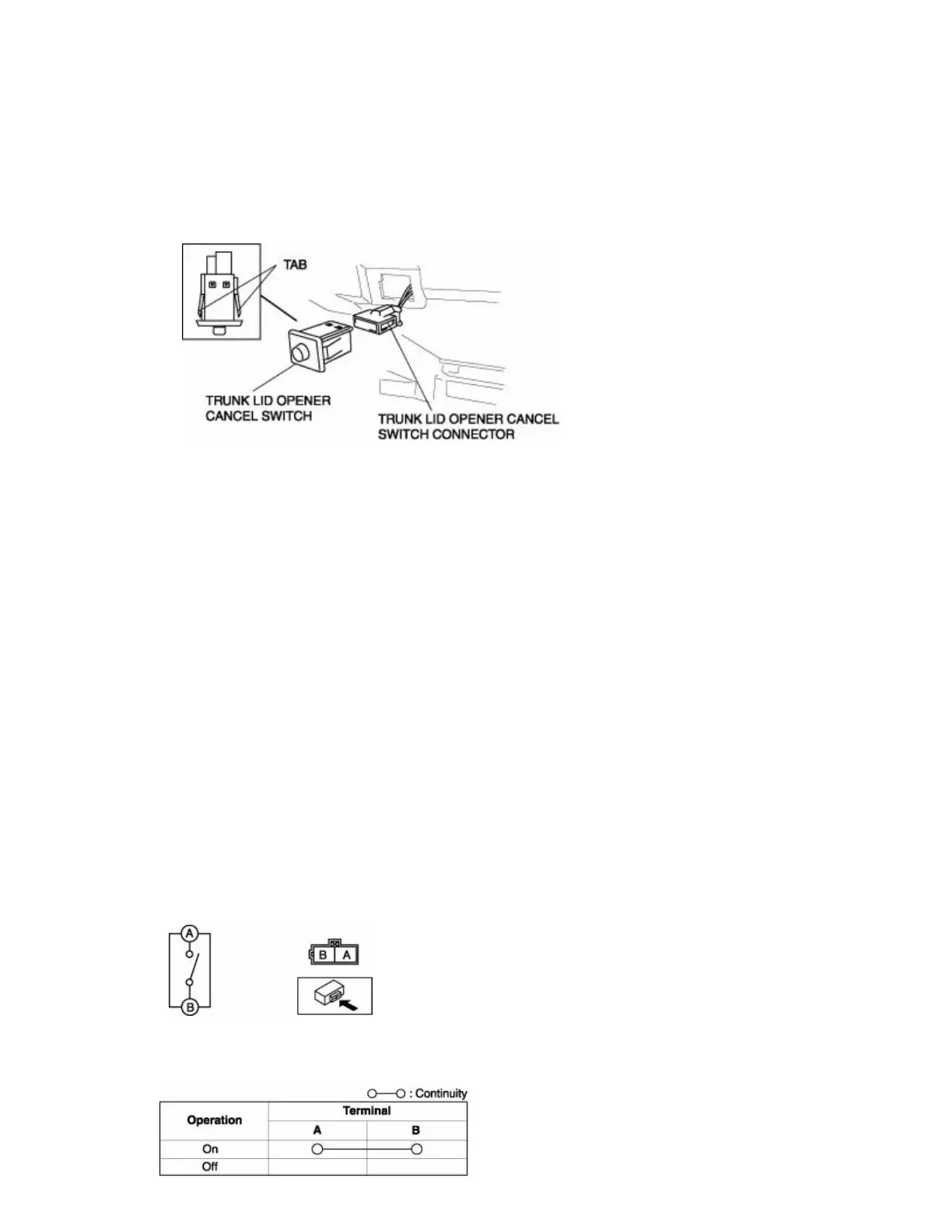 2. Inspect for continuity between the trunk lid open cancel switch terminals.