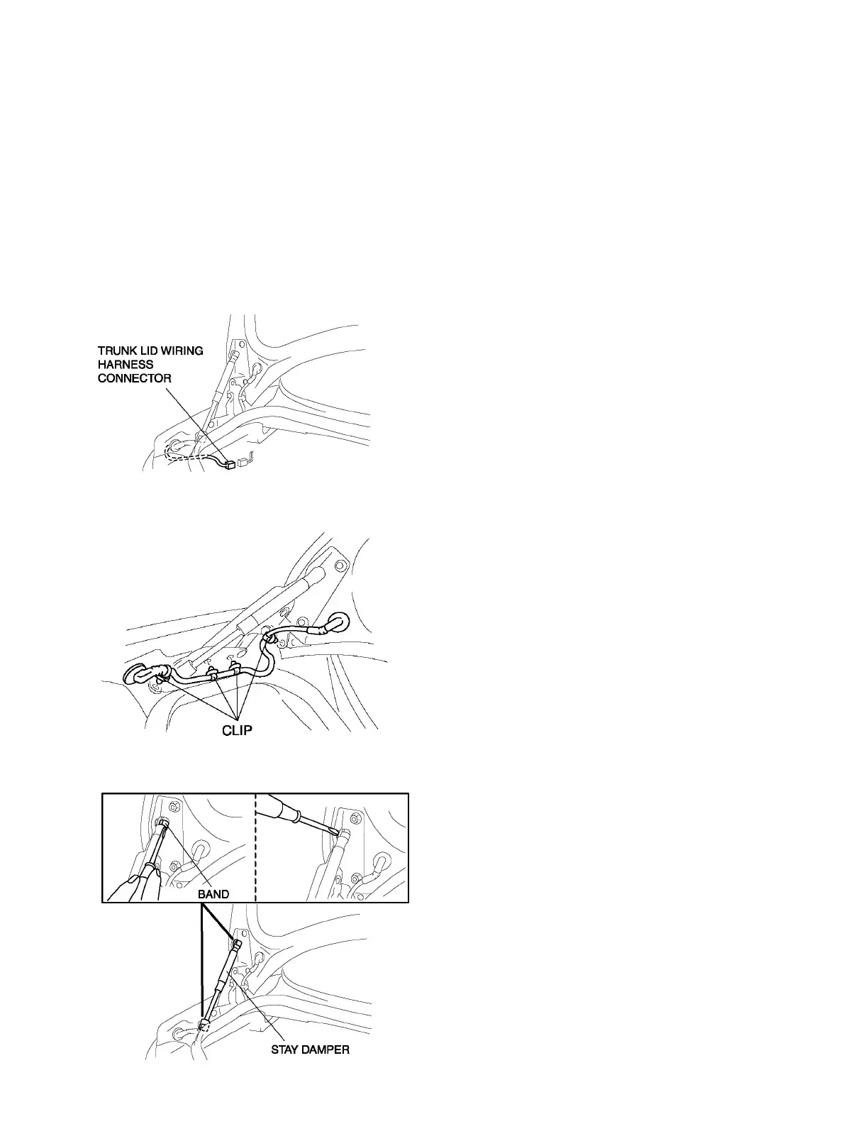 • Removing the stay damper without supporting the trunk lid can be dangerous. The trunk lid may fall and