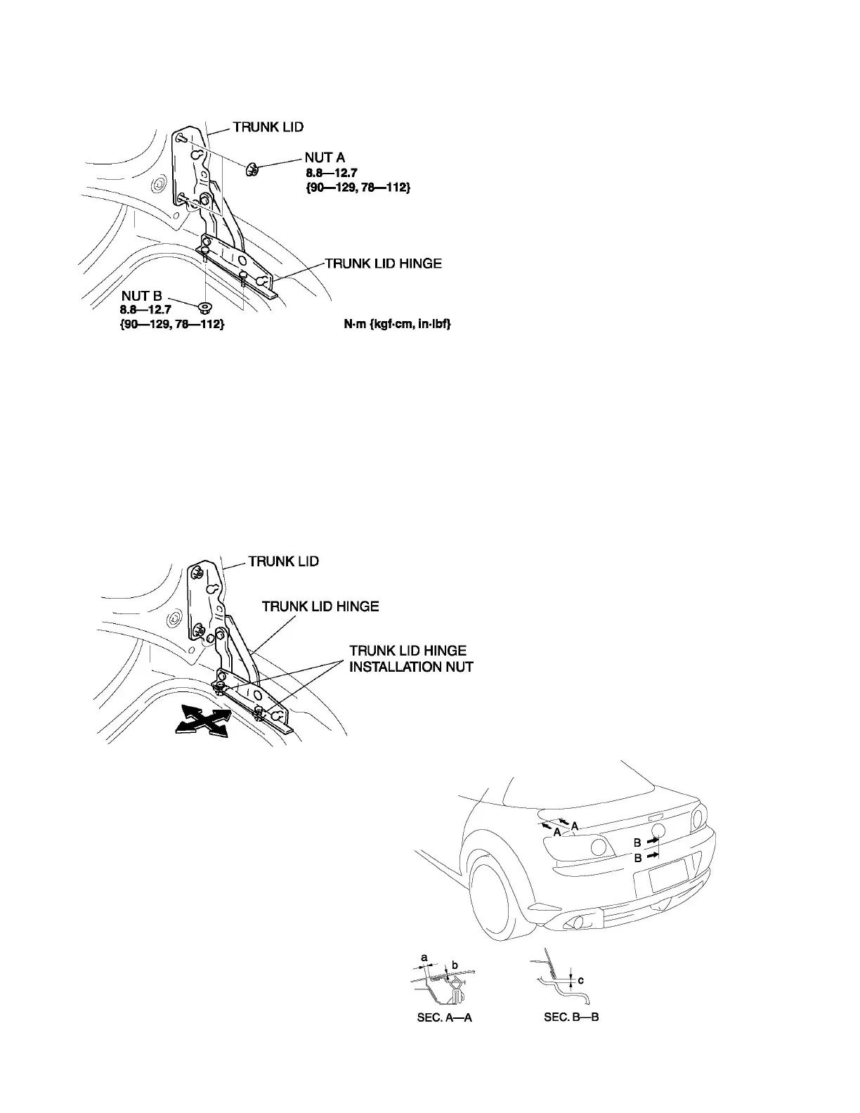 2. Loosen the trunk lid hinge installation nuts or the trunk lid lock striker installation screws, and adjust the