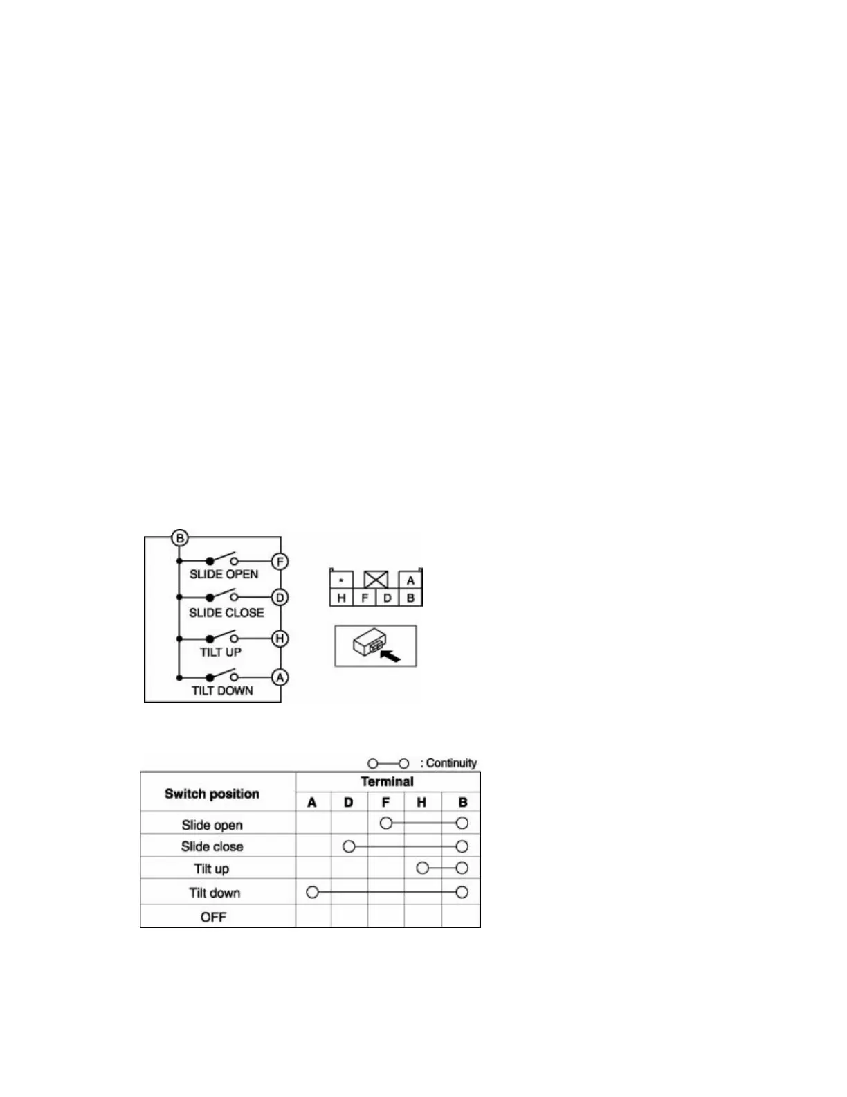 1. Verify that the continuity between the sunroof switch is as indicated in the table.
