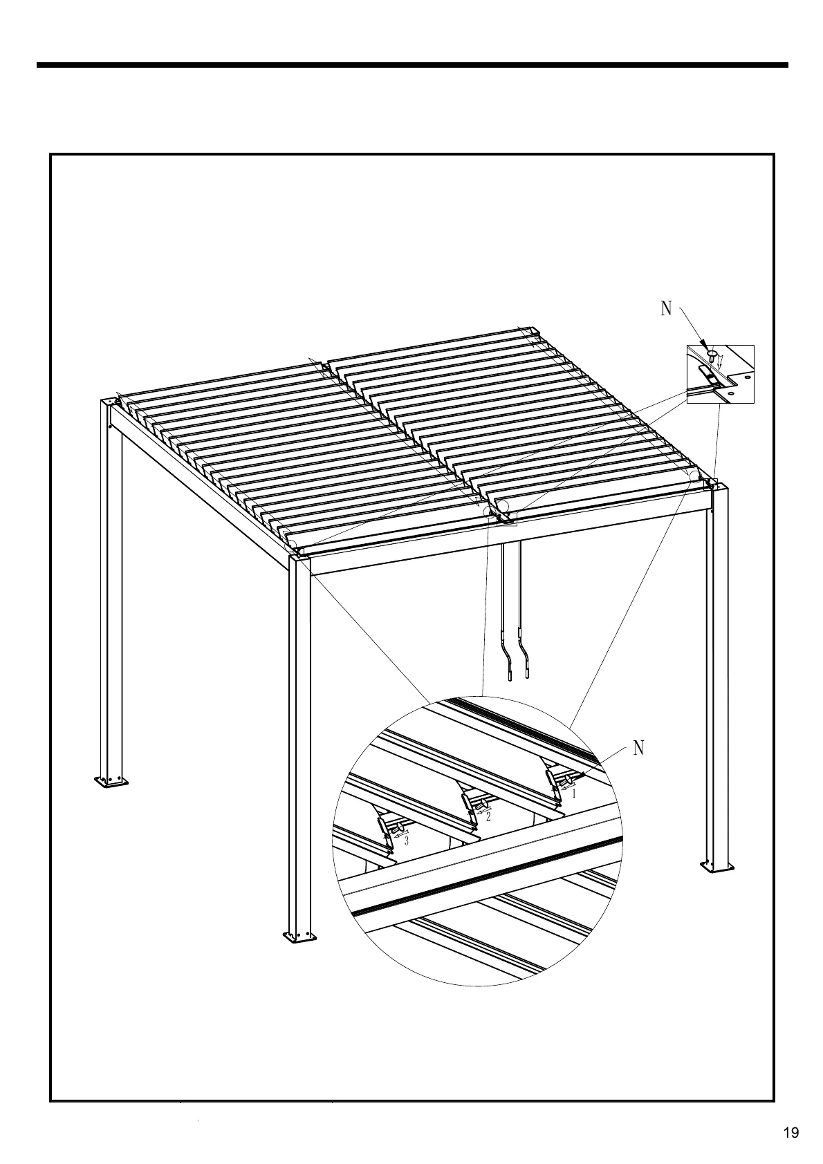 18. Continue to add slat (E), along with the plastic jams (N) until all slats are fitted.
