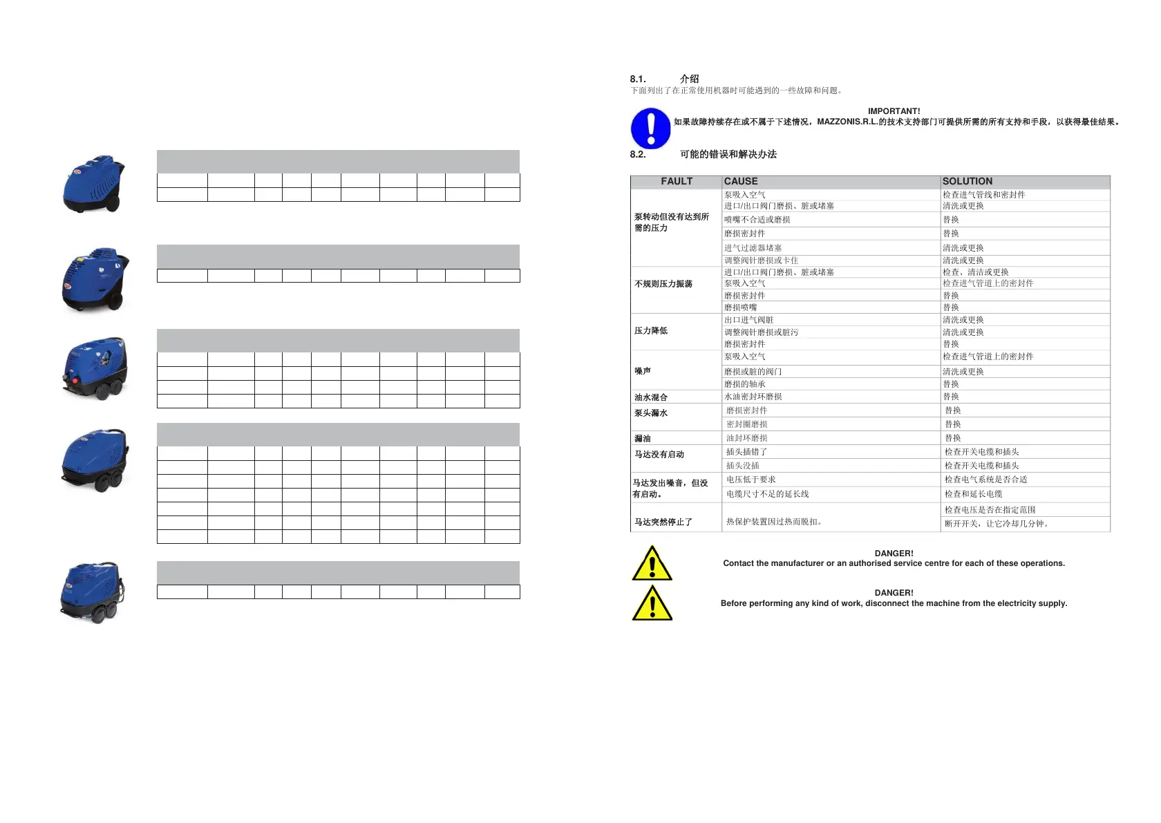 如果故障持续存在或不属于下述情况,MAZZONIS.R.L.的技术支持部门可提供所需的所有支持和手段,以获得最佳结果。