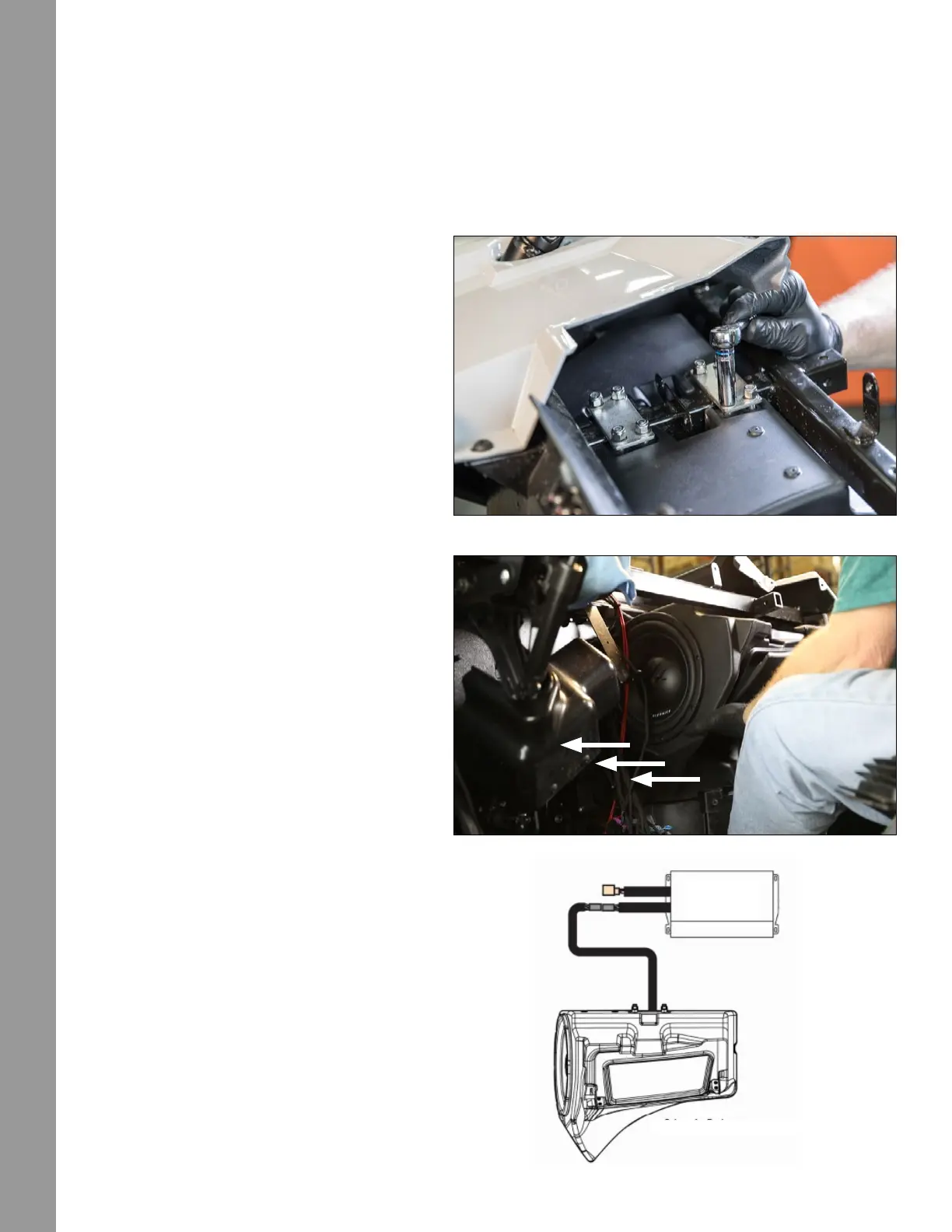 Sitting on the oor of the RZR, hold the subwoofer enclosure up to the grab bar pipe. Sitting on the oor