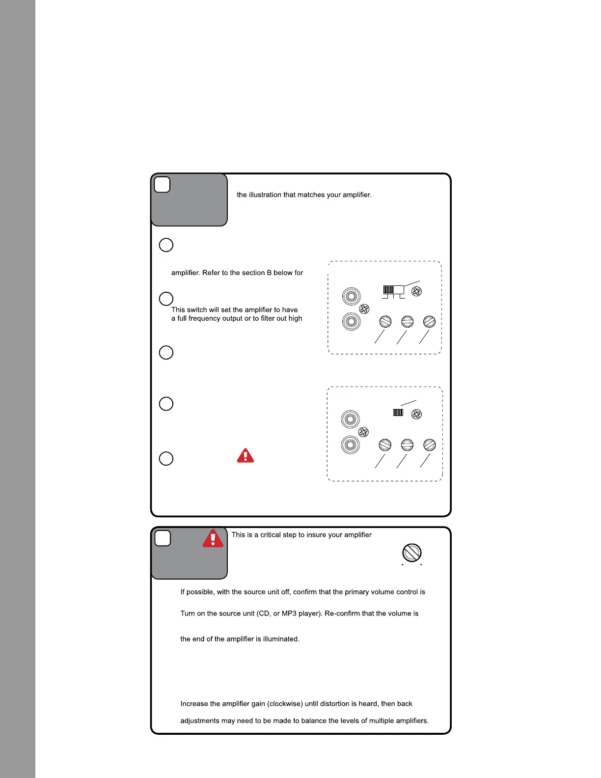 NOTE – Gain control, it is important to adjust each amplier gain as described in the manual. Remember,