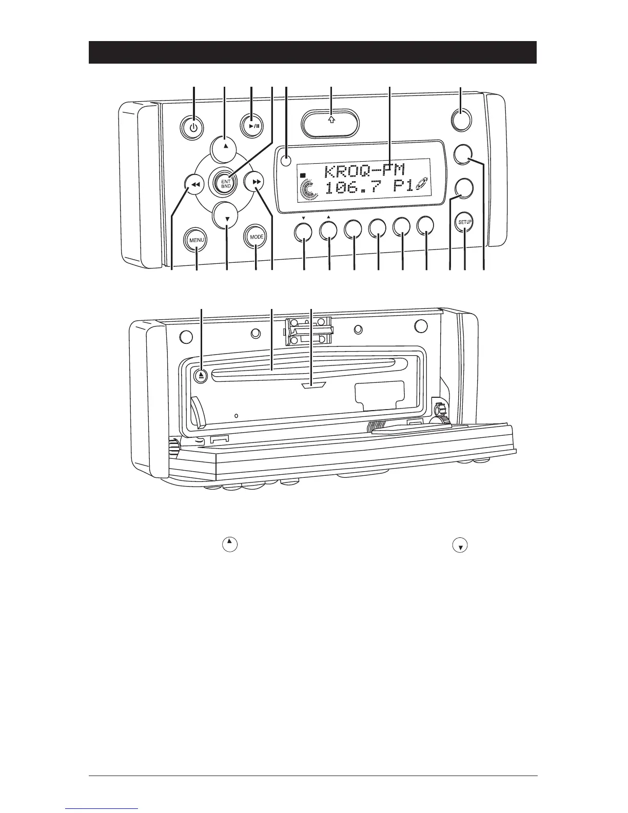 6. Open Button: Press to fold down the front panel to access the CD player slot and disc eject button.
