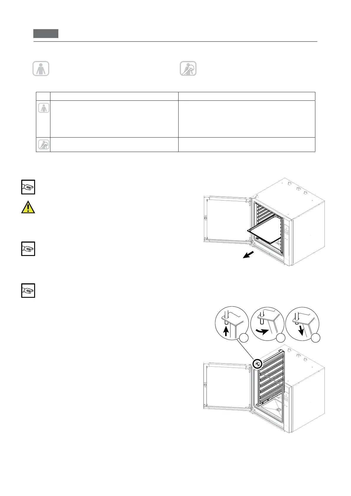 Åben døren og tag pladerne ud (hvis de er sat i) fra holderne (g. 1).