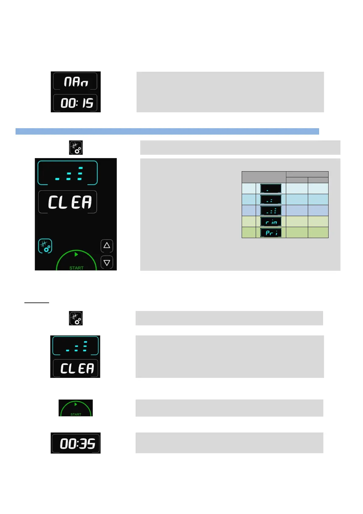 Display shows “CLEA” (cleaning) in the timer zone and the intensity in the temperature