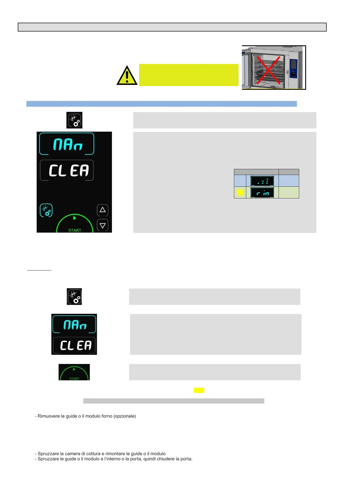 - Detergente spray su tutte le superfici esposte. Utilizzare esclusivamente prodotti specifici per la pulizia di cavità di cottura professionali in