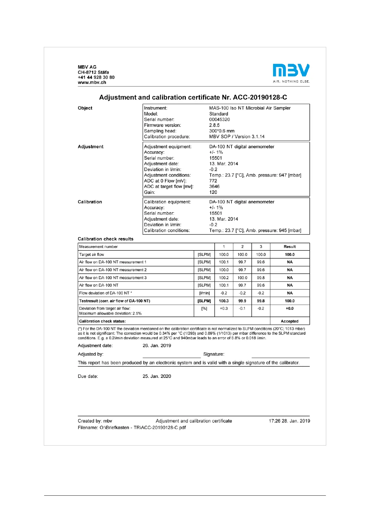 EXAMPLE - ADJUSTMENT AND CALIBRATION CERTIFICATE