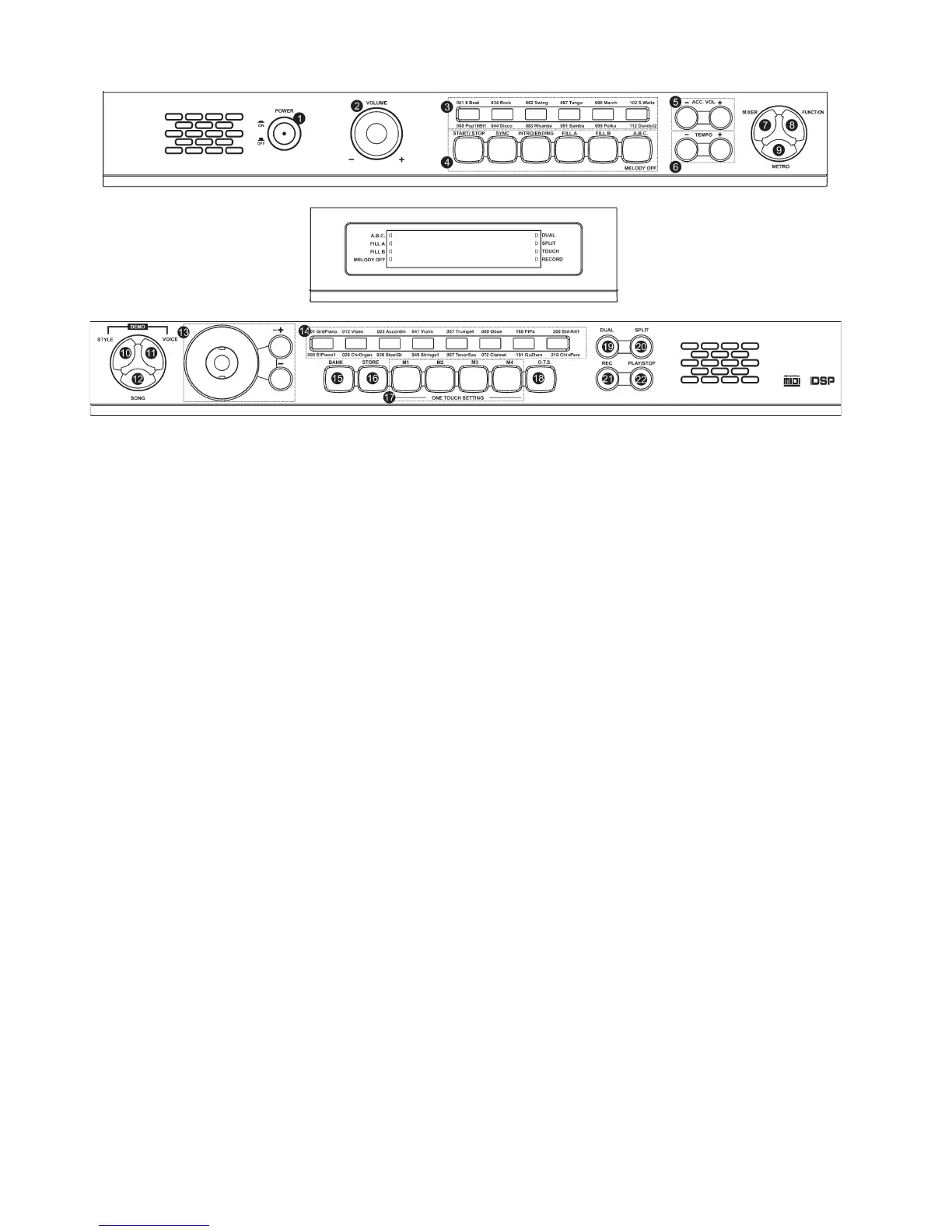 20 Taste „SPLIT“ für das Aufteilen der Klaviatur in zwei Teile (z.B. Schlagzeug links, Piano rechts)